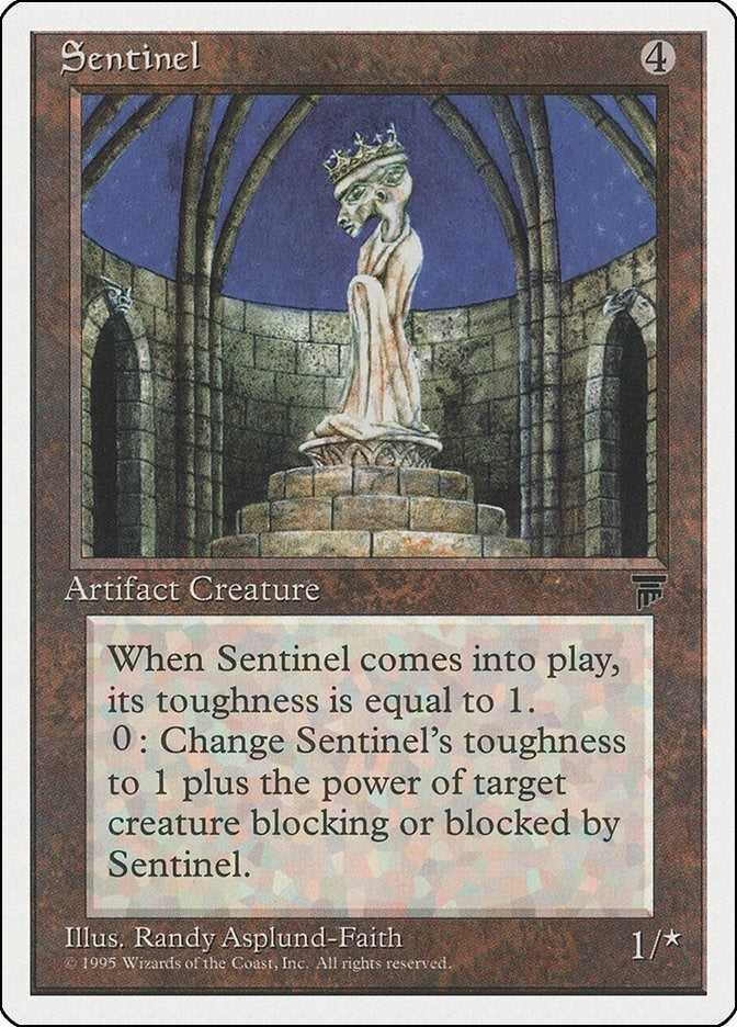 | Rules Text Contains: | When Sentinel comes into play, its toughness is equal to 1.0: Change Sentinel’s toughness to 1 plus the power of target creature blocking or blocked by Sentinel. |